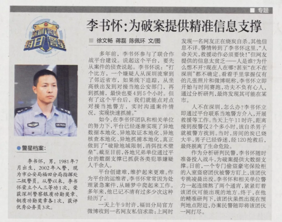 一天上午9時(shí)許,福田分局官方微博收到一名網(wǎng)友私信求助:上網(wǎng)時(shí)發(fā)現(xiàn)一名網(wǎng)友正在燒炭自殺,其他信息不詳。警情轉(zhuǎn)到了李書懷這里,“人命關(guān)天,救援動(dòng)作必須要快!”但網(wǎng)友提供的信息太貧乏——人是誰?為什么想不開?現(xiàn)在人在哪?甚至“在不在深圳”都不確定??粗掷镎莆諆H有的幾張照片和微博昵稱,李書懷立即開始與時(shí)間賽跑,功夫不負(fù)有心人,通過分析研判,最終發(fā)現(xiàn)其可能在某市。