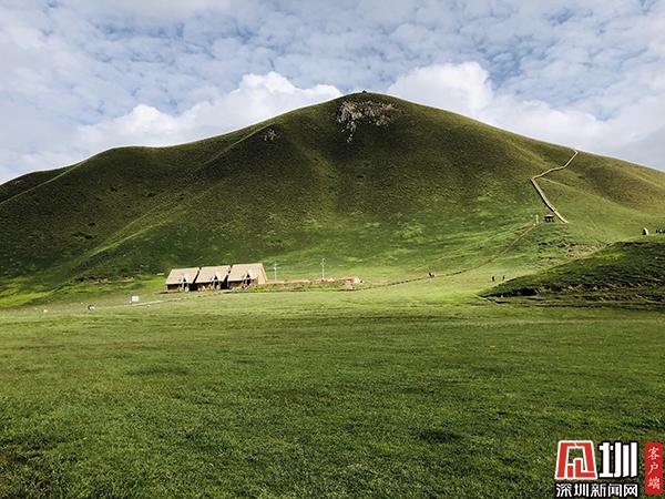 次日早上起來,見昆侖雪山近在咫尺,陽光照射在雪山頂上,倍感圣潔耀眼。雪山下面是綠綠的草原,草原上羊兒成群,馬兒四處奔跑,加上白色的蒙古包點綴其中,風景十分迷人。身在草原上周身舒暢,心情自然也明朗起來。一條木制棧道沿山而上,像條長龍盤旋在山上,登高望遠,風景如畫。