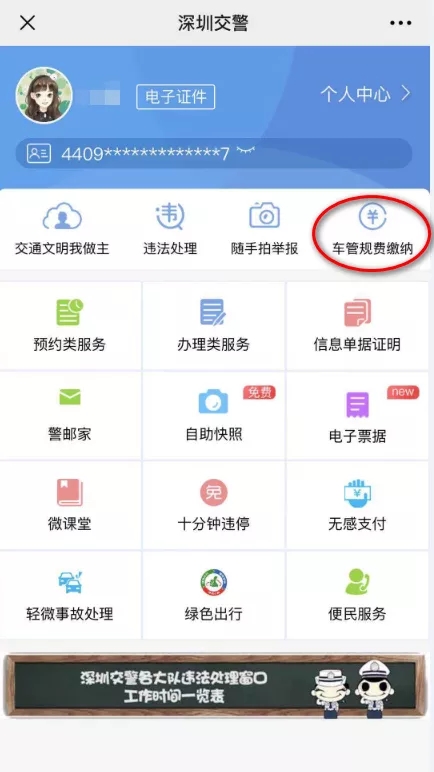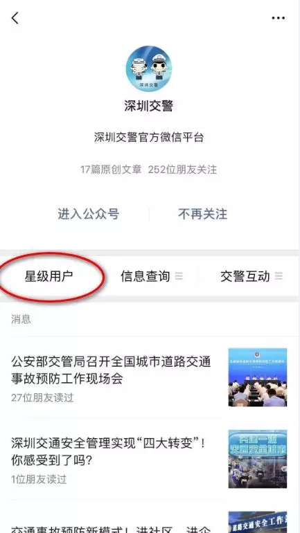 01 車(chē)主本人/代辦人關(guān)注【深圳交警】微信公眾號(hào),點(diǎn)擊進(jìn)入【星級(jí)用戶】,注冊(cè)登錄星級(jí)用戶后,在頁(yè)面選擇【車(chē)管規(guī)費(fèi)繳納】。