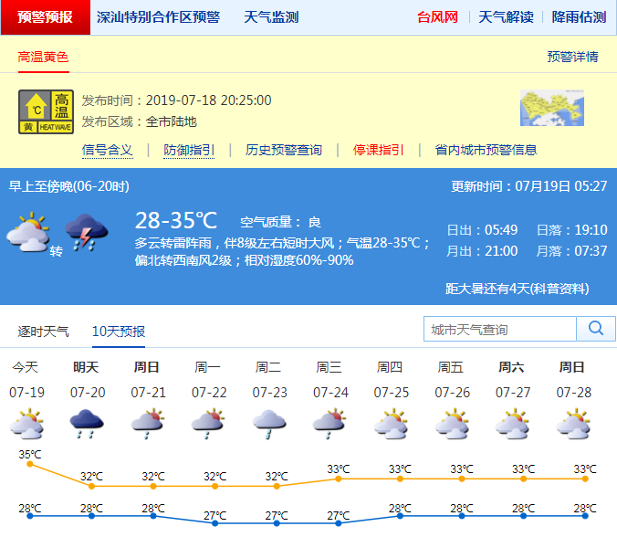 深圳新聞網(wǎng)2019年7月19日訊 受臺(tái)風(fēng)外圍下沉氣流影響,19日多云為主,天氣酷熱;受西南氣流影響,午后有雷雨,雨時(shí)伴有短時(shí)強(qiáng)降水和8級(jí)左右大風(fēng);氣溫28-35℃,中北部和人口密集區(qū)最高氣溫可達(dá)37℃以上。18日白天,全市氣溫普遍在35℃~37℃左右,其中最高氣溫達(dá)到39.6℃。高溫橙色預(yù)警信號(hào)繼續(xù)生效中。