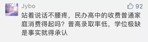 45.38%的公辦普高錄取率意味著有一半以上的學(xué)生上不了公辦普高,只能求其次,選擇職業(yè)學(xué)校和民辦高中。雖然說教育沒有高低之分,但是絕大多數(shù)家長都希望自己的孩子能夠上公辦普高,這也是競爭激烈的原因之一。為什么接受不了民辦高中?除了擔(dān)心辦學(xué)質(zhì)量問題,網(wǎng)友主要覺得民辦學(xué)費(fèi)貴。