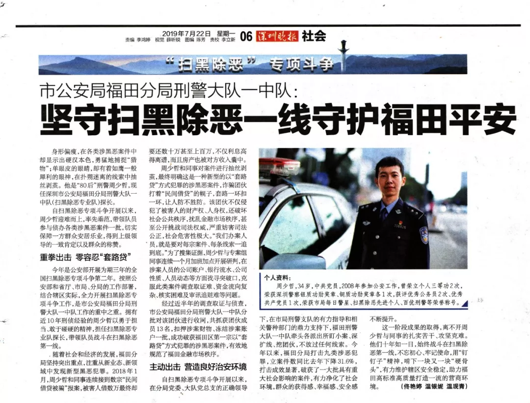 今年是公安部開展為期三年的全國掃黑除惡專項斗爭的第二年。按照公安部和省廳、市局、分局的工作部署,結合轄區(qū)實際,全力開展掃黑除惡專項斗爭工作,是市公安局福田分局刑警大隊一中隊工作的重中之重。擁有近10年刑偵經(jīng)驗的周少哲以勇于擔當、敢于碰硬的精神,擔任掃黑除惡專業(yè)隊探長,帶領隊員戰(zhàn)斗在掃黑除惡第一線。