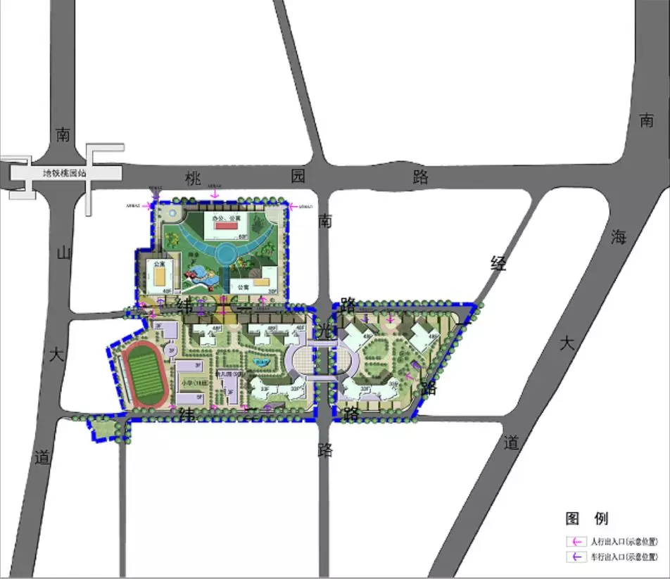 項目將采取TOD模式(以公共交通為導(dǎo)向的開發(fā)模式)開發(fā),計劃將居住、商業(yè)、辦公和公共空間解決在600米之內(nèi)的范圍。該項目由1棟60F寫字樓公寓、2棟30F-40F公寓、9棟33F-48F超高層住宅以及1所18班小學(xué)、1所9班幼兒園組成。