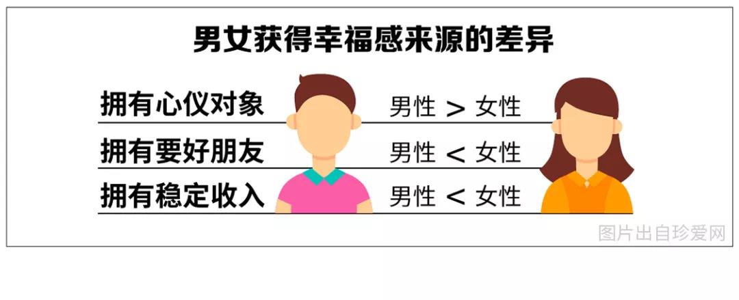 深入研究發(fā)現(xiàn),男性對(duì)“擁有心儀對(duì)象”的需求比例(6.67%)略高于女性(3.17%),女性則是在擁有要好朋友的比例(28.79%)上高于男性(6.67%),且因?yàn)榉€(wěn)定收入感到幸福的女性比例(60%)比男性(53%)更高??梢?jiàn),女性更容易從穩(wěn)定的收入中獲得幸福感。