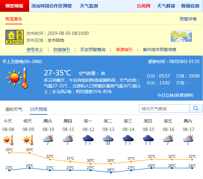 隨著第9號臺風“利奇馬”逐漸靠近,深圳逐漸受其外圍偏北下沉氣流影響,預計8-9日深圳市高溫加劇,晴天間多云,有輕微至輕度霾,氣溫28-35℃,北部和人口密集地區(qū)最高氣溫37℃以上,午后局地有熱雷雨,雨時伴有短時大風。