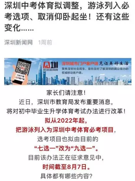 調(diào)整后,深圳體育中考分?jǐn)?shù)由統(tǒng)一現(xiàn)場考試成績分值32分、過程性考核(平時(shí)成績)分值12分和《國家學(xué)生體質(zhì)健康標(biāo)準(zhǔn)》測試分值6分組成,滿分為50分。其中,體育考試考試項(xiàng)目仍為“1+1”,即考生參加1項(xiàng)必考科目和1項(xiàng)選考項(xiàng)目。必考科目由現(xiàn)在的200米跑和中長跑(800米[女]和1000米[男])任選其一調(diào)整為中長跑(800米[女]和1000米[男])或100米游泳任選其一。