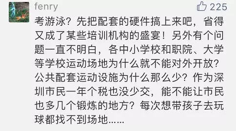 在留言中,多數(shù)家長(zhǎng)表示,如果確定將游泳納入中考體育必考選項(xiàng),希望學(xué)校體育教學(xué)也能進(jìn)行相關(guān)配套。而小編了解到解到,目前深圳小學(xué)、初中學(xué)校開設(shè)游泳課最大的難點(diǎn)在于場(chǎng)地。