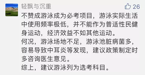 對(duì)于游泳納入中考體育必考選項(xiàng),家長(zhǎng)們的看法不一。支持者認(rèn)為,“游泳本來就是一項(xiàng)求生技能,納入考試,孩子們都要學(xué)習(xí),除了鍛煉身體,還能減少意外的發(fā)生?!币灿腥苏J(rèn)為“很多學(xué)校都沒有開設(shè)游泳課,學(xué)習(xí)硬件設(shè)施跟不上也白搭?!狈磳?duì)者則認(rèn)為,“游泳實(shí)際生活中使用頻率極低,并不能作為普適性健身運(yùn)動(dòng),納入選考更合適”“學(xué)校的硬件設(shè)施跟不上,課外游泳培訓(xùn)費(fèi)傷不起?!?/p>