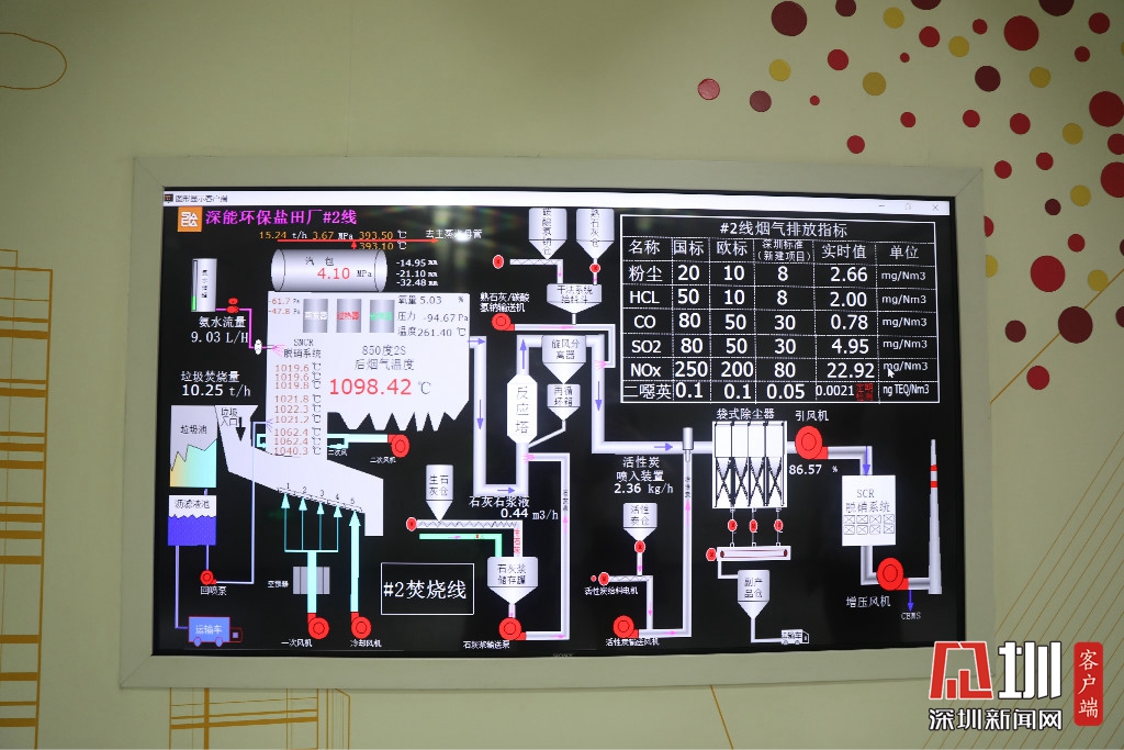 廠內(nèi)還設(shè)有煙氣指標電子屏,屏上可以看到粉塵、氯化氫、一氧化碳等多項煙氣排放實時數(shù)值。據(jù)介紹,深圳實行的排放標準遠遠高于國家標準和歐盟標準。從發(fā)電廠外望去,從煙囪上方看不到一點煙霧。
