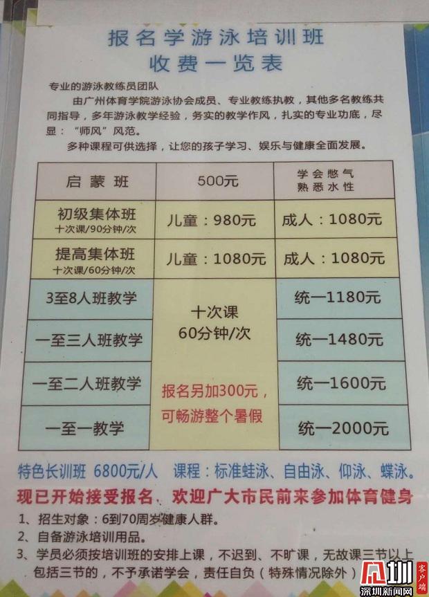 記者采訪獲悉,龍崗區(qū)華南城附近某游泳培訓(xùn)班,已推出了游泳中考滿分班項(xiàng)目,價(jià)格為28000元,三年內(nèi)可無限次數(shù)上課;對(duì)中考體育游泳科目分?jǐn)?shù)要求在80分的,價(jià)格為20000元,課時(shí)不限。