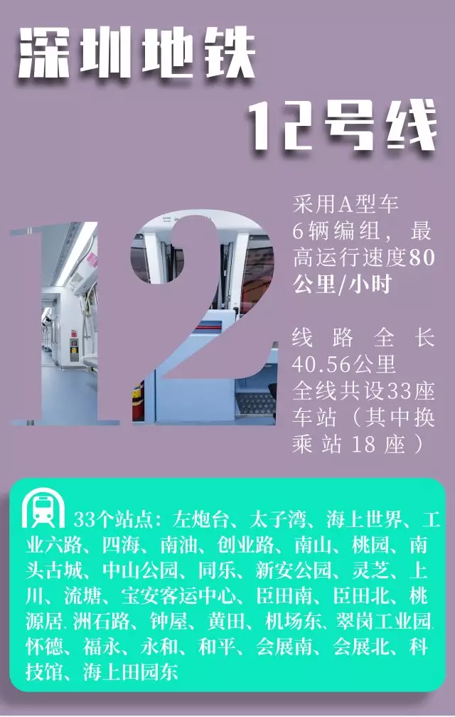地鐵12號線起自南山區(qū)左炮臺站自南向北穿越南山中心區(qū)、寶安中心區(qū)、福永、大空港等片區(qū)后終至寶安區(qū)海上田園東站,線路全長40.56km,是進一步支撐深圳西部發(fā)展,提升前海蛇口自貿(mào)區(qū),空港新城發(fā)展品質(zhì)的交通骨干線。