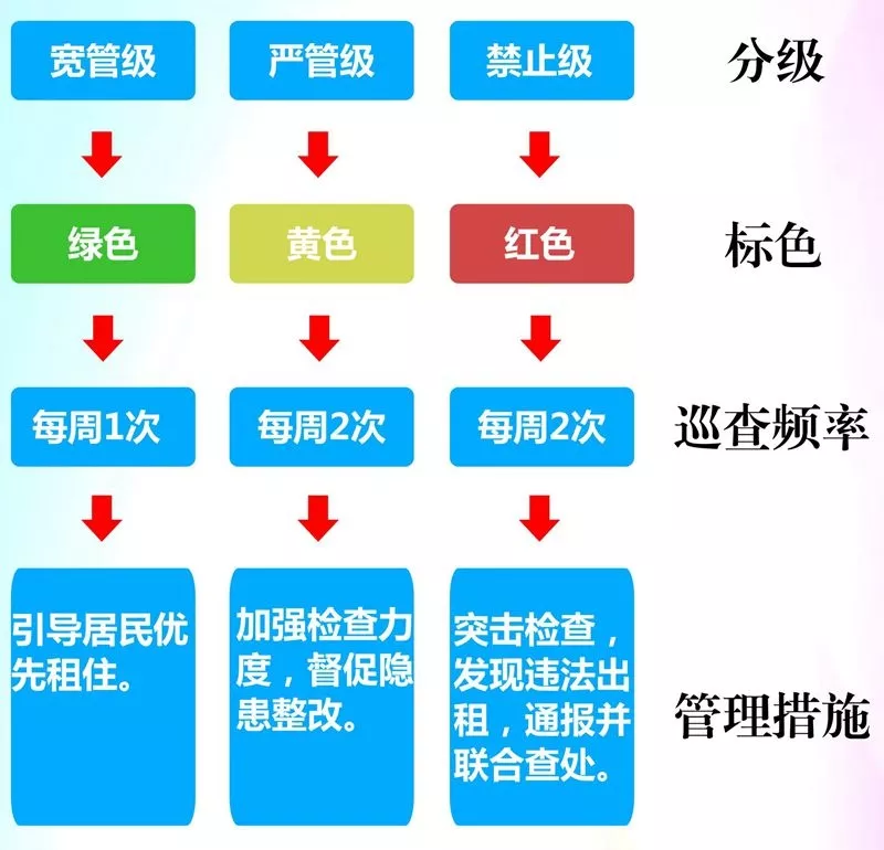 出租屋將分為寬管級(綠標)、關(guān)注級(黃標)、嚴管級(橙標)、禁止級(紅標)四個級別。結(jié)合房屋二維碼對四個級別實行動態(tài)標色管理,以房屋二維碼的底色來標注。