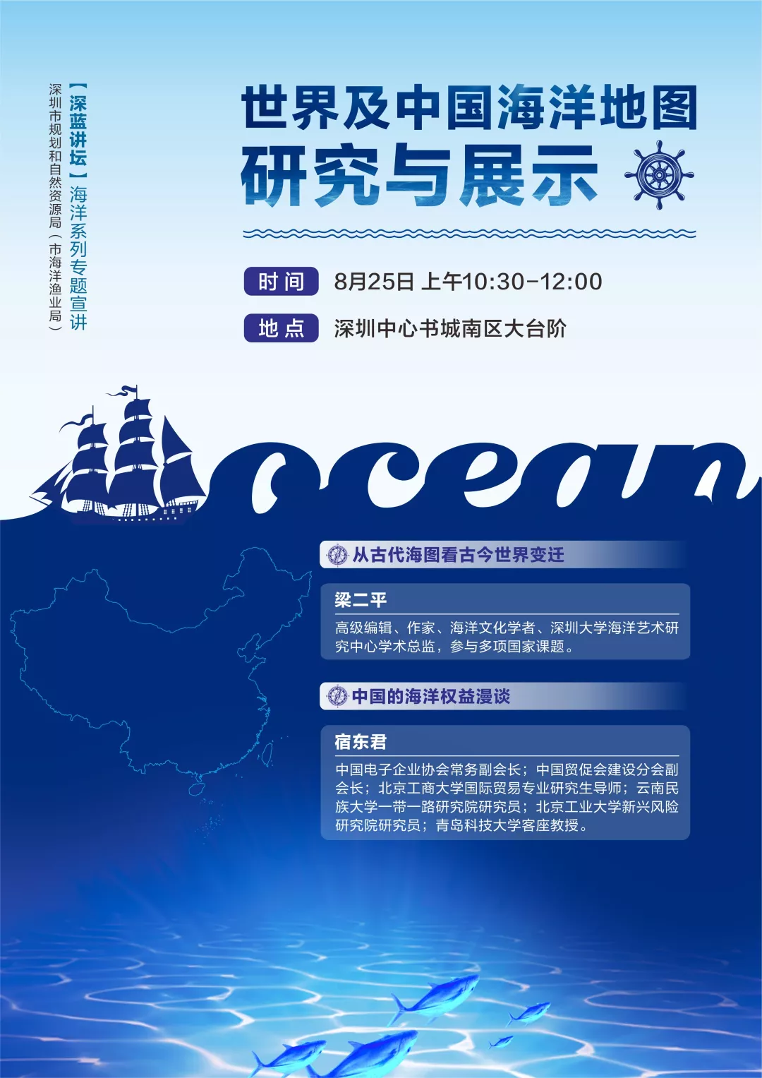 麥哲倫完成了第一次環(huán)球航行、哥倫布發(fā)現(xiàn)了新大陸、迪亞士最早探險(xiǎn)至非洲最南端好望角、達(dá)伽馬開(kāi)辟了通往印度的新航線…… 2000多年前,在茫茫大海上 裝備簡(jiǎn)陋的航海者 取暖靠抖、通訊靠吼 沒(méi)有網(wǎng)絡(luò)、沒(méi)有手機(jī)、沒(méi)有GPS …… 卻能在廣闊無(wú)邊的大海中 找到心之所向的目的地 這是因?yàn)?/p> 他們有一張神奇的圖——海圖 梁二平:從古代海圖看古今世界變遷 世界上這一次又一次的航海大發(fā)現(xiàn),或者是由黃金、白銀、香料、瓷器、黑奴貿(mào)易等所引發(fā)的大侵略、大移民、大變革,都在一張小小的圖中展現(xiàn)得淋漓盡致。 大航海時(shí)代早期,西班牙、葡萄牙稱霸海洋,出盡了風(fēng)頭,靠的就是海圖。后來(lái)英國(guó)擊敗荷蘭,意識(shí)到光靠戰(zhàn)爭(zhēng)是控制不了海洋的,更重要的是海洋知識(shí)。于是,英國(guó)設(shè)立了一個(gè)水文部,專門進(jìn)行測(cè)量和制作海圖。這便是一代“海上霸主”崛起的關(guān)鍵。 每一幅海圖 都承載著豐富的地理、社會(huì)及歷史信息 不同時(shí)代、地域,不同文化背景下的海圖繪制者 對(duì)空間有著不同的理解 描繪世界的方式也有所不同 海圖一步一步從文字描述到精確標(biāo)注 東西方海圖相互交融發(fā)展 為海洋變遷提供了真實(shí)的見(jiàn)證 一張小小的海圖 卻扮演著舉足輕重的“角色” 其實(shí),它也和海洋權(quán)益 也有著密不可分的關(guān)系 宿東君:中國(guó)的海洋權(quán)益漫談 談及主權(quán)問(wèn)題 我們總是滿懷著一腔熱血 看紀(jì)錄片時(shí) 海上時(shí)不時(shí)會(huì)漂浮著一個(gè)個(gè)小浮標(biāo) 想知道小浮標(biāo)對(duì)海洋科技考察有什么作用? 中國(guó)先驅(qū)又是如何歷盡艱難險(xiǎn)阻 主張屬于中國(guó)的海洋權(quán)益的? 想知道引發(fā) 南海問(wèn)題、釣魚(yú)島問(wèn)題的“來(lái)龍去脈”嗎? 以上的種種疑問(wèn) 都將在8月25日的“”深藍(lán)講壇” 一同為你揭曉! “深藍(lán)講壇” 2017年5月,《全國(guó)海洋經(jīng)濟(jì)發(fā)展“十三五”規(guī)劃》明確提出推進(jìn)深圳建設(shè)全球海洋中心城市,在投融資、服務(wù)貿(mào)易、商務(wù)旅游等方面進(jìn)一步提升對(duì)外開(kāi)放水平和國(guó)際影響力,打造成為“21世紀(jì)海上絲綢之路”的排頭兵和主力軍;2018年9月,市委市政府印發(fā)《關(guān)于勇當(dāng)海洋強(qiáng)國(guó)尖兵加快建設(shè)全球海洋中心城市的決定》及實(shí)施方案;2019年,深圳創(chuàng)建全球海洋中心城市納入到《粵港澳大灣區(qū)規(guī)劃發(fā)展綱要》和《關(guān)于支持深圳建設(shè)中國(guó)特色社會(huì)主義先行示范區(qū)的意見(jiàn)》。 為讓社會(huì)了解這一重要政策,計(jì)劃通過(guò)開(kāi)展“深藍(lán)講壇”專題系列活動(dòng),通過(guò)專家講授、市民互動(dòng)等活動(dòng),請(qǐng)市民對(duì)我市海洋發(fā)展政策、主要目標(biāo)和實(shí)施路徑等建言獻(xiàn)策,在擴(kuò)大影響面的同時(shí)收集好的意見(jiàn)和建議,以更好地推動(dòng)我市海洋各項(xiàng)工作的順利開(kāi)展,為我市創(chuàng)建全球海洋中心城市營(yíng)造氛圍,奠定思想基礎(chǔ)。 現(xiàn)在,“深藍(lán)講壇”專題系列活動(dòng)真的來(lái)了! 8月25日 以“世界及中國(guó)海洋地圖研究與展示”為主題 2019年首場(chǎng)“深藍(lán)講壇”海洋系列專題宣講活動(dòng) 即將拉開(kāi)帷幕