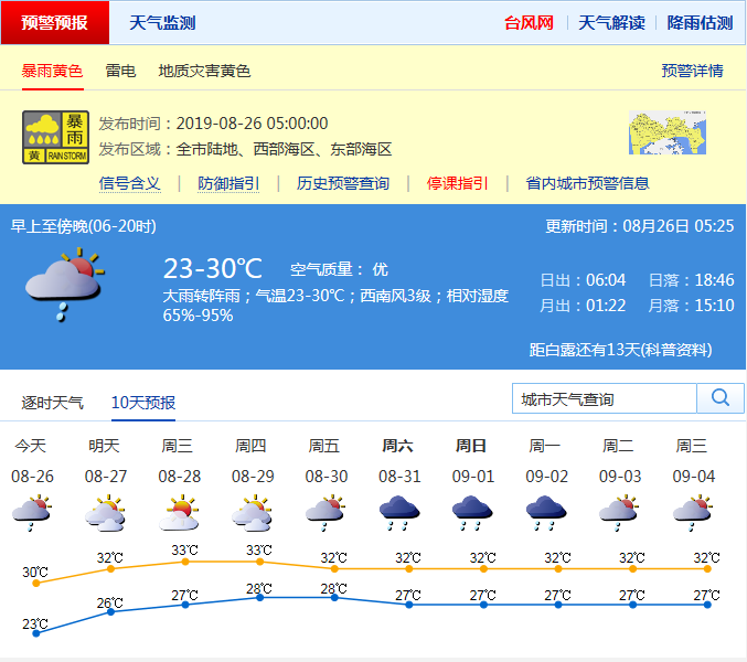 見圳客戶端·深圳新聞網(wǎng)2019年8月26日訊 今年第11號(hào)臺(tái)風(fēng)“白鹿”已經(jīng)于昨日7時(shí)25分在福建省東山縣沿海登陸后,已減弱為熱帶低壓,向西偏北方向移動(dòng),市氣象臺(tái)已于昨日17時(shí)取消臺(tái)風(fēng)白色預(yù)警信號(hào)。據(jù)市氣象局預(yù)計(jì),今日白天大雨轉(zhuǎn)陣雨,降雨減弱;27-29日多云間晴天,天氣趨于悶熱。