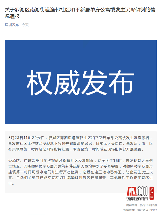 見圳客戶端.深圳新聞網(wǎng)2019年8月28日訊(見圳客戶端、深圳新聞網(wǎng)記者 張玲)8月28日11時(shí)20分許,羅湖區(qū)南湖街道漁邨社區(qū)和平新居單身公寓樓發(fā)生沉降傾斜,事發(fā)前社區(qū)工作站已發(fā)現(xiàn)地下異響并撤離疏散居民,目前無人員傷亡。目前相關(guān)部門已成立專家組對(duì)沉降傾斜原因開展調(diào)查,其他善后工作正在有序進(jìn)行。臨時(shí)疏散人員被安置到濱河小學(xué)、羅湖小學(xué)、羅湖中學(xué)高級(jí)初中部。