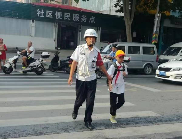 不停地牽手護(hù)送剛開學(xué)的學(xué)生過馬路。