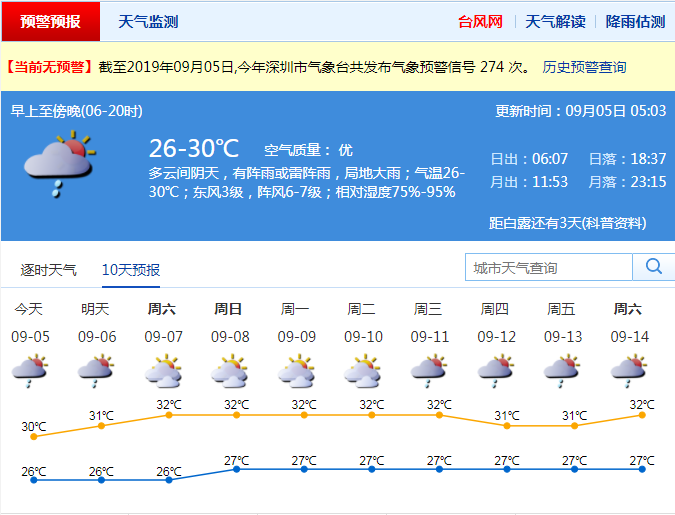 見圳客戶端、深圳新聞網(wǎng)2019年9月5日訊 今年14號臺風(fēng)“劍魚”(熱帶風(fēng)暴級)3日17時(shí)減弱為熱帶低壓后,其風(fēng)力進(jìn)一步減弱,已難以確定其環(huán)流中心,中央氣象臺于4日2時(shí)停止對其編號。市氣象臺于4日8時(shí)30分取消臺風(fēng)白色預(yù)警信號。盡管如此,受“劍魚”減弱后低壓槽影響,今日我市有大雨局部暴雨,沿海、海區(qū)和高地陣風(fēng)6-7級;6日降雨減弱;7日起轉(zhuǎn)多云,有短時(shí)陣雨,天氣炎熱。