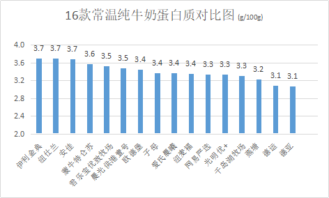 16款常溫純牛奶蛋白質(zhì)含量均符合我國國標(biāo)要求,但蛋白質(zhì)含量表現(xiàn)差異大,伊利金典、紐仕蘭、安佳、蒙牛特侖蘇蛋白質(zhì)含量較高,德運(yùn)、德亞蛋白質(zhì)含量相對較低,接近國標(biāo)最低限值要求。