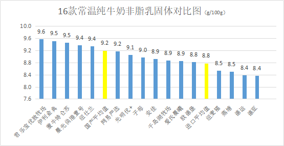 測評結(jié)果顯示:君樂寶優(yōu)質(zhì)牧場、伊利金典、蒙牛特侖蘇非脂乳固體含量排前三,8款國產(chǎn)牛奶非脂乳固體平均值9.2g/100g,8款進(jìn)口牛奶非脂乳固體平均值8.8g/100g,均高于國標(biāo)要求,國產(chǎn)牛奶表現(xiàn)優(yōu)于進(jìn)口牛奶。