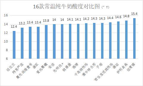 8款國產(chǎn)牛奶酸度在13~15°T之間。8款進(jìn)口牛奶中紐麥福全脂純牛奶的酸度15.4°T,紐仕蘭牧場全脂牛奶酸度12.4,其它6款也是13~15°T之間。其中,紐仕蘭、網(wǎng)易嚴(yán)選、晨光供港壹號、德亞酸度較低,表明新鮮度和熱穩(wěn)定性較好。