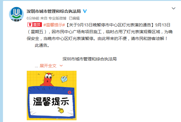9月13日晚,也是就是中秋節(jié)當(dāng)晚,中心區(qū)燈光表演暫停