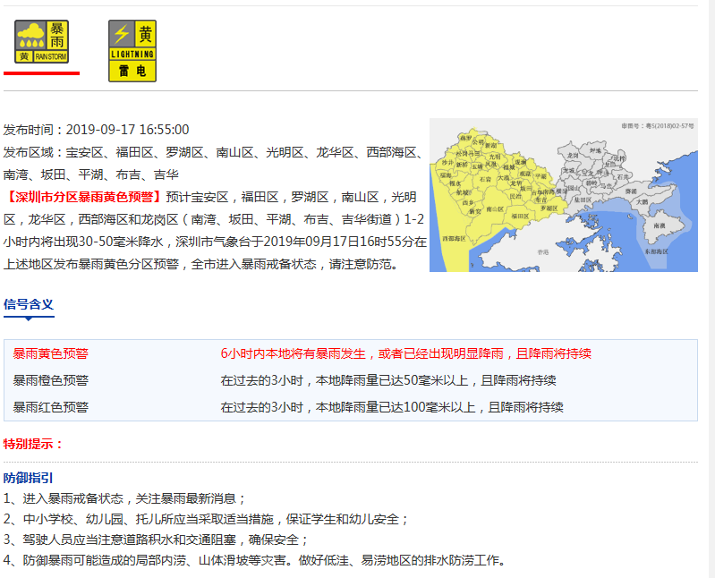 市氣象局預(yù)計(jì)寶安區(qū),福田區(qū),羅湖區(qū),南山區(qū),光明區(qū),龍華區(qū),西部海區(qū)和龍崗區(qū)(南灣、坂田、平湖、布吉、吉華街道)1-2小時(shí)內(nèi)將出現(xiàn)30-50毫米降水,深圳市氣象臺(tái)于2019年09月17日16時(shí)55分在上述地區(qū)發(fā)布暴雨黃色分區(qū)預(yù)警,全市進(jìn)入暴雨戒備狀態(tài),請注意防范。