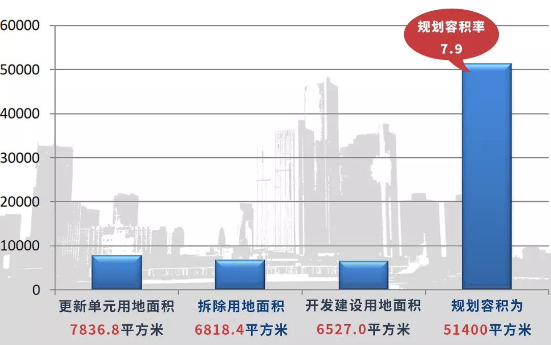 ▲更新單元用地面積7836.8平方米,拆除用地面積6818.4平方米,開發(fā)建設用地面積6527.0平方米,規(guī)劃容積為51400平方米,規(guī)劃容積率7.9。