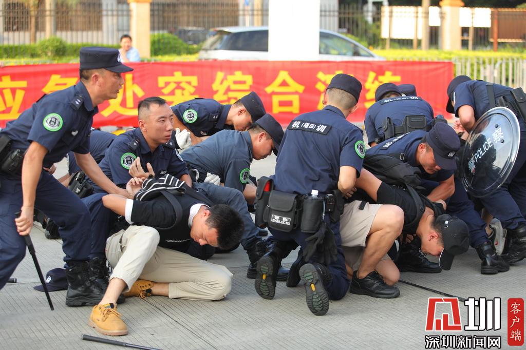 下午5時,隨著演練總指揮福田區(qū)委副書記黃曉鵬一聲令下,演練正式開始?;蕧徣刖硰d,黑衣“不法分子”拒檢、傷人、拉橫幅鬧事,海關(guān)、邊檢呼叫增援……事態(tài)步步升級,觸發(fā)皇崗口岸聯(lián)勤聯(lián)動機制,根據(jù)應急預案,隨著各項指令有條不紊地下達,皇崗口岸派出所、福田反恐大隊、武警深圳支隊、福田交警大隊、福田急救中心、福田街道武裝部民兵應急分隊、皇崗口岸管理處等聯(lián)勤聯(lián)動力量,迅速趕到現(xiàn)場進行處置。在“法律告知”無效、危險行為繼續(xù)的情況下,警方果斷實施抓捕,將黑衣“不法分子”一網(wǎng)打盡,在最短時間內(nèi)恢復了皇崗口岸的正常秩序。