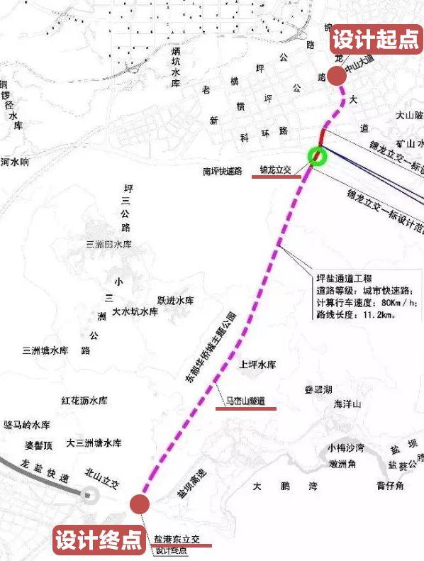 坪鹽通道北起坪山區(qū)現(xiàn)狀錦龍大道坪山大道路口,南至鹽田區(qū)鹽壩高速、鹽港東立交,全長約11.252公里。