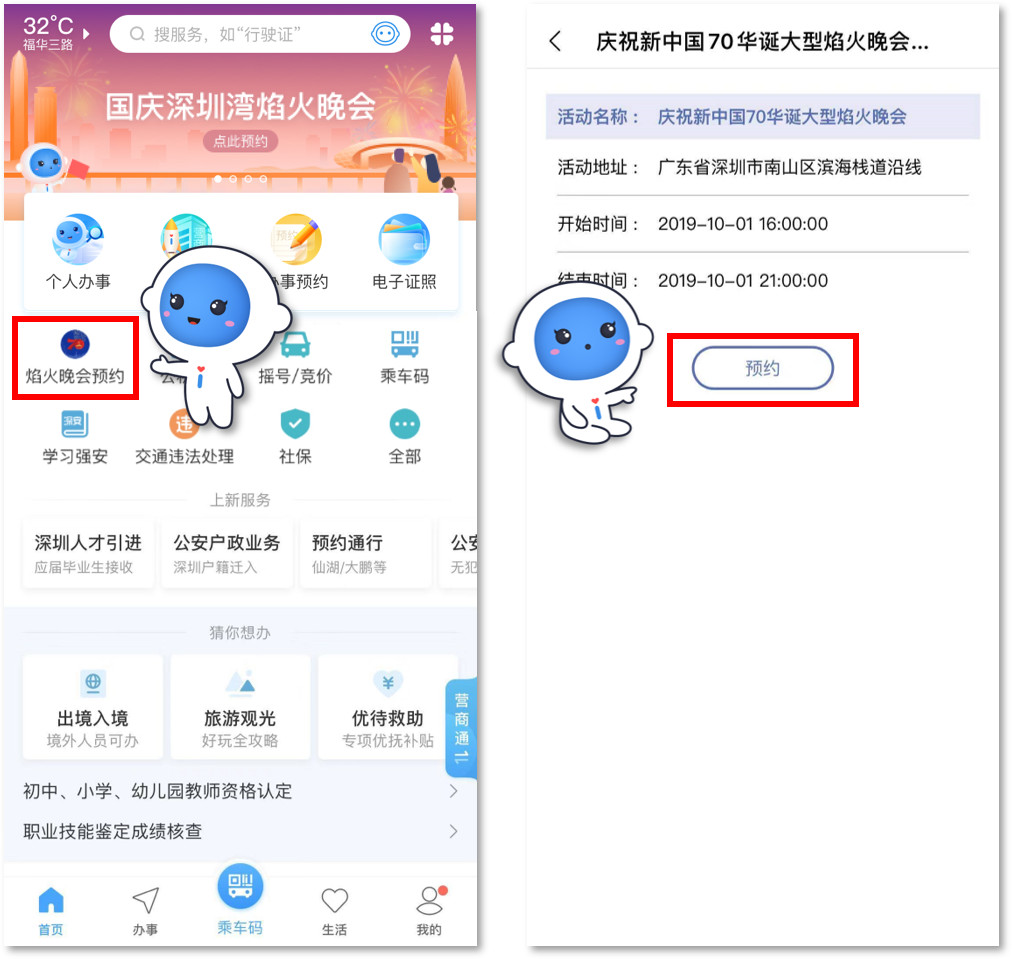 2.點擊首頁頂部圖片或焰火晚會預(yù)約入口進入預(yù)約頁面,點擊預(yù)約: