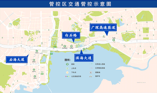 以深圳灣人才公園為中心,濱海大道(南海立交至竹子林立交段雙方向)、沙河西路(濱海大道至東濱立交雙方向)、望海路(東濱立交至中心段雙方向)、中心路(科苑南路至望海路雙方向)、科苑南路(東濱路至中心路段東側(cè))、東濱路(后海濱路至科苑南路段,不含)、后海濱路(濱海大道至東濱路,不含)的合圍區(qū)域?qū)嵤┙煌ü苤疲灰约盀I海大道東往西方向(竹子林立交至南海立交),西往東方向(南海立交至竹子林立交)實施交通管制。