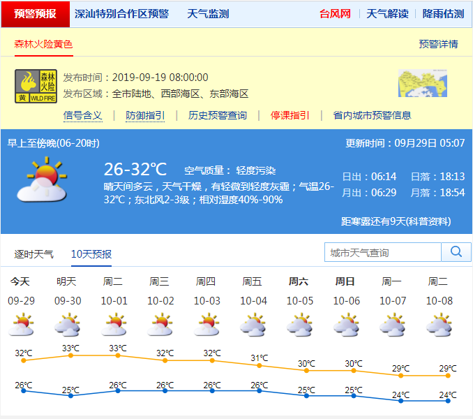見圳客戶端·深圳新聞網(wǎng)2019年9月29日訊 今天9月29日深圳晴天間多云,天氣干燥,有輕微到輕度灰霾,氣溫26-32℃;東北風2-3級;相對濕度40%-90%。森林火險預警生效中,請繼續(xù)做好防火安全宣傳和管理工作。