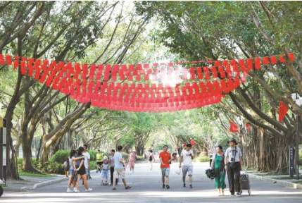 深圳晚報2019年10月04日訊 百花競艷紅旗飄,金秋鵬城節(jié)味濃。栩栩如生的“鳳凰飛羽”花帶沿著深南大道展翅欲飛;約500條城市道路上超10萬面國旗迎風(fēng)招展,化身紅色海洋;蓮花山公園、筆架山公園等22家市政公園變身繽紛花?!瓏鴳c游園,滿眼蒼翠、花團(tuán)錦簇、生機(jī)勃勃。深圳這座“千園之城”以熱烈、喜慶、祥和的面貌為市民帶來了歡愉和快樂。