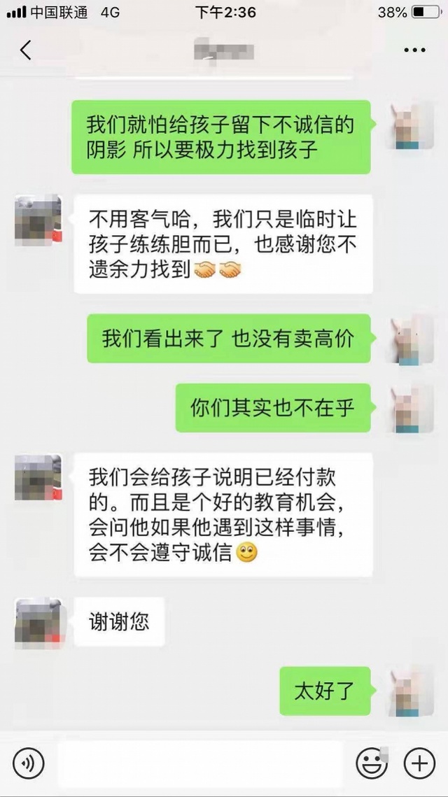 賣水男孩爸爸告訴張先生,他是從朋友的轉(zhuǎn)發(fā)中,看到這個(gè)消息的。他介紹說,他們那天只是臨時(shí)讓孩子練練膽,并對(duì)張先生努力尋找孩子,實(shí)現(xiàn)對(duì)孩子承諾的誠(chéng)信行為表示感謝?!拔視?huì)給孩子說明已經(jīng)付款的,而且這是個(gè)好的教育機(jī)會(huì),我會(huì)問他,如果他遇到這樣的事情,會(huì)不會(huì)遵守誠(chéng)信?!辟u水男孩爸爸告訴張先生,“沒有想到你為了守護(hù)一份誠(chéng)信,借助網(wǎng)絡(luò)媒體的力量,花大力氣尋找并支付礦泉水錢,這份堅(jiān)持,讓我們和孩子都非常感動(dòng)。我們也已經(jīng)與孩子溝通整件事情,并借此機(jī)會(huì)告訴他換位思考,如果遇到類似情況,也應(yīng)堅(jiān)持誠(chéng)信、與人為善的傳統(tǒng)美德?!?/p>