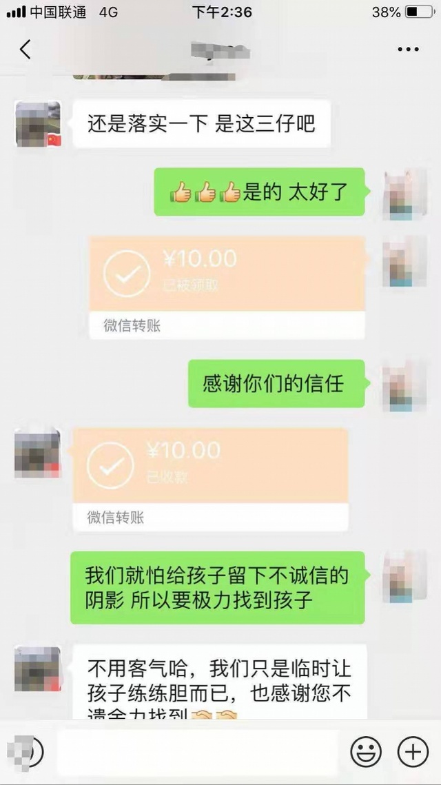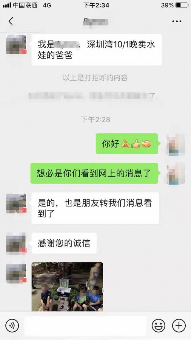4日,剛從深圳返回青島的張先生告訴記者,中午2時(shí)35分,他的微信出現(xiàn)一個(gè)新增好友,對(duì)方說自己是深圳灣10月1日晚賣水男孩的爸爸,張先生立刻把對(duì)方加為好友。賣水男孩爸爸通過微信給張先生發(fā)來一張照片,是國(guó)慶當(dāng)晚孩子在路邊賣水時(shí)拍的,讓張先生確認(rèn)一下是不是照片上的孩子?!笆撬麄儯昧?,終于找到了?!睆埾壬S即通過微信轉(zhuǎn)賬10元錢過去,賣水男孩爸爸也收款成功。(此前報(bào)道:緊急尋人!深圳灣畔的賣水孩子,青島大叔在找你…)