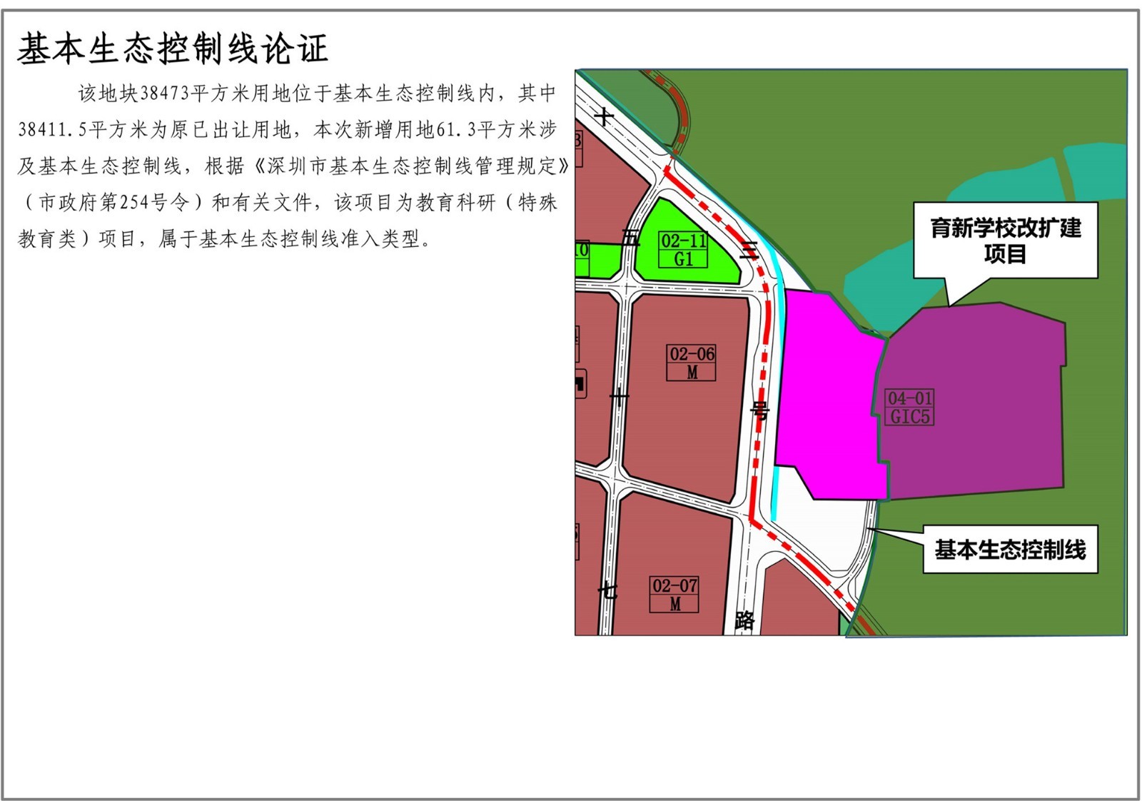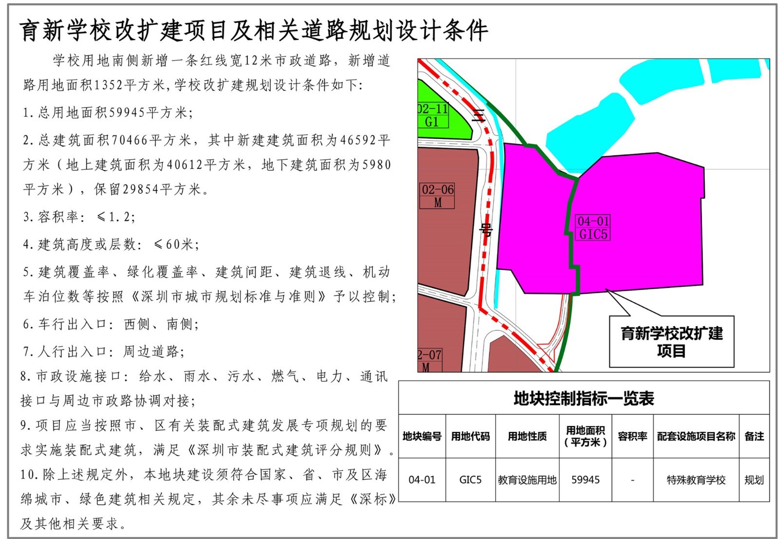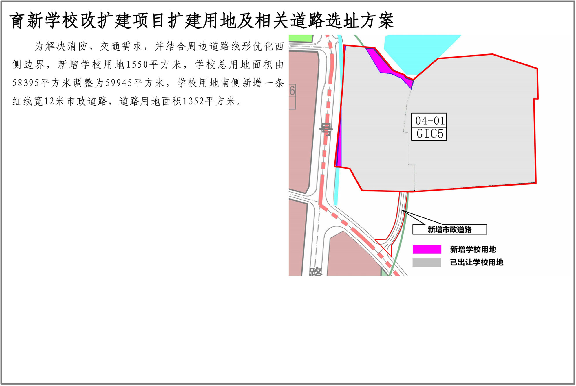 深圳市育新學(xué)校位于光明街道碧眼社區(qū),規(guī)劃觀(guān)光路(現(xiàn)狀已建)和二十三號(hào)路(現(xiàn)狀已建)交叉口西北側(cè)。為消除校園消防、交通出行安全隱患,滿(mǎn)足規(guī)范需求,新增學(xué)校用地1550平方米,以解決消防、交通需求,并結(jié)合周邊道路線(xiàn)形優(yōu)化西側(cè)邊界,學(xué)??傆玫孛娣e由58395平方米調(diào)整為59945平方米,學(xué)校用地南側(cè)新增一條紅線(xiàn)寬12米市政道路,道路用地面積1352平方米。