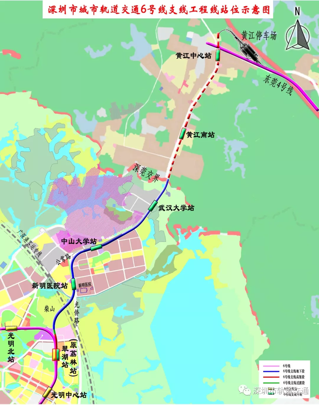 地鐵6號(hào)線支線位于深圳市光明區(qū),線路起點(diǎn)設(shè)置于6號(hào)線翠湖站(不含土建部分)東側(cè),線路終點(diǎn)設(shè)置于公常路深莞邊界東莞黃江鎮(zhèn),共設(shè)3站4區(qū)間。其中翠湖站為6號(hào)線支線與6號(hào)線的換乘站。