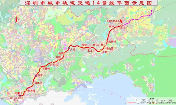 站點(diǎn):崗廈北、黃木崗、清水河、布吉、石芽嶺、六約北、四聯(lián)、坳背、大運(yùn)、寶荷、寶龍、沙湖、坪山圍、坪山廣場(chǎng)、朱洋坑、坑梓、沙田