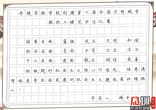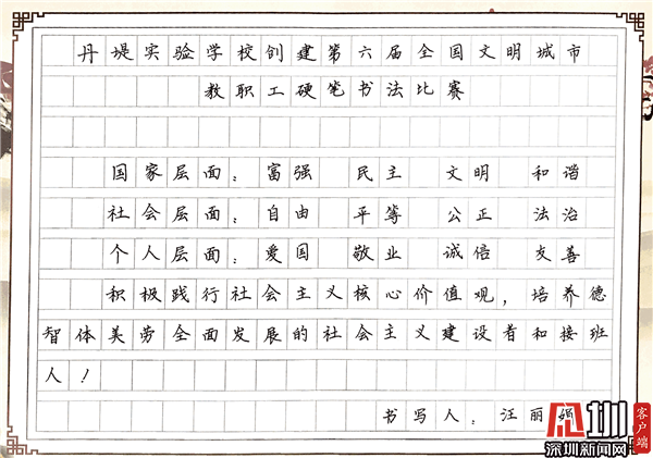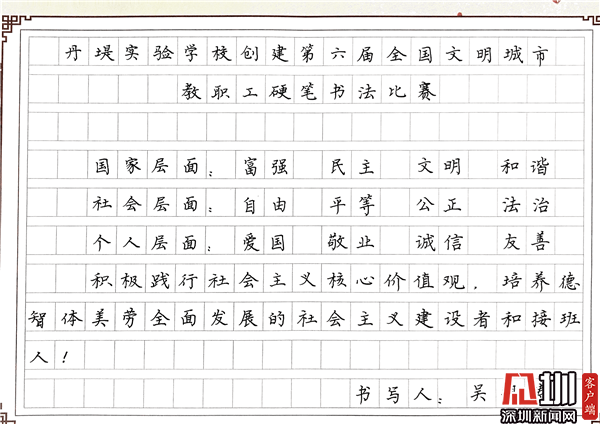 見(jiàn)圳客戶(hù)端·深圳新聞網(wǎng)10月29日訊(見(jiàn)圳客戶(hù)端、深圳新聞網(wǎng)記者 潘寶儀 通訊員 袁小俊 圖/朱雅琪 ) 為落實(shí)立德樹(shù)人總目標(biāo)、培育和踐行社會(huì)主義核心價(jià)值觀,創(chuàng)建文明城市,積極倡導(dǎo)全校教職工勤練教學(xué)基本功,提高教師綜合素養(yǎng),豐富課余生活,展示丹堤實(shí)驗(yàn)學(xué)校教職工風(fēng)采,學(xué)校于10月25日舉行了“創(chuàng)建第六屆全國(guó)文明城市教職工硬筆書(shū)法比賽”。