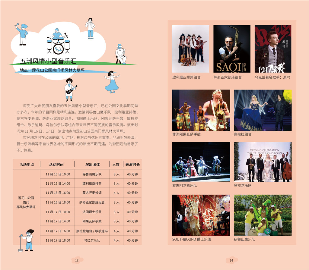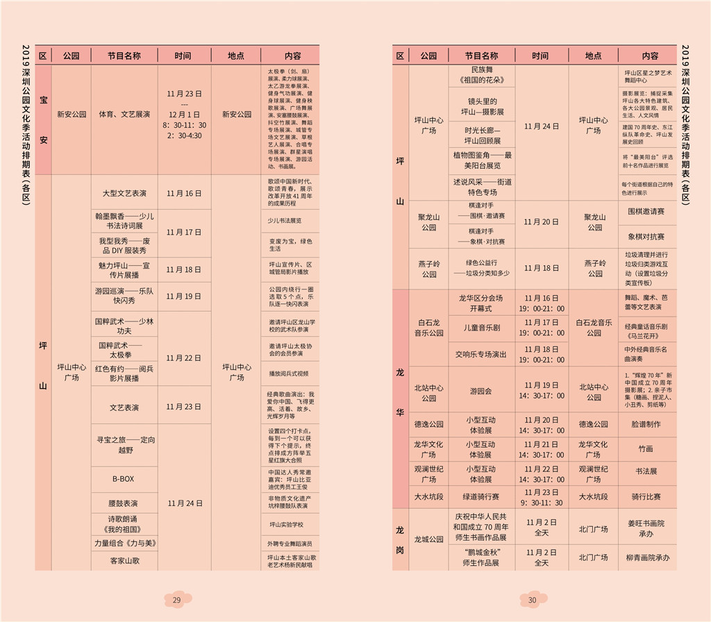 記者了解到,11月8日,2019深圳公園文化季將正式啟幕,持續(xù)至12月8日,為期一個(gè)月。舉辦地點(diǎn)包括蓮花山公園、深圳灣公園、園博園、東湖公園、中心公園、筆架山公園、皇崗公園等7個(gè)市屬公園和22個(gè)區(qū)屬公園。其中,市屬公園重點(diǎn)活動(dòng)將集中在周末舉行,為廣大市民帶來(lái)精彩紛呈的公園文化盛宴。