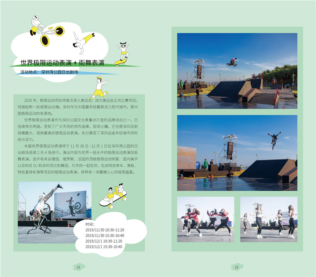 相比往年,今年既有年輕人熱衷的草地音樂(lè)會(huì)、街舞表演,針對(duì)青少年的網(wǎng)球、足球公開(kāi)賽,又有兒童愛(ài)看的童話音樂(lè)劇,還有老年人喜愛(ài)的戲曲專場(chǎng)等等,活動(dòng)節(jié)目覆蓋各個(gè)年齡段。例如,今年的深圳灣草地音樂(lè)會(huì)由中央民族樂(lè)團(tuán)、廣州交響樂(lè)團(tuán)、深圳交響樂(lè)團(tuán)坐鎮(zhèn)表演,既突出民族特色,又有粵港澳和國(guó)際元素;世界極限運(yùn)動(dòng)由來(lái)自多國(guó)的頂級(jí)運(yùn)動(dòng)明星帶來(lái)表演。此外,還有多項(xiàng)首次開(kāi)展的活動(dòng),例如,首屆自然教育嘉年華、新增街頭藝人表演等,契合深圳創(chuàng)意之都的特點(diǎn),彰顯深圳的包容與多元。