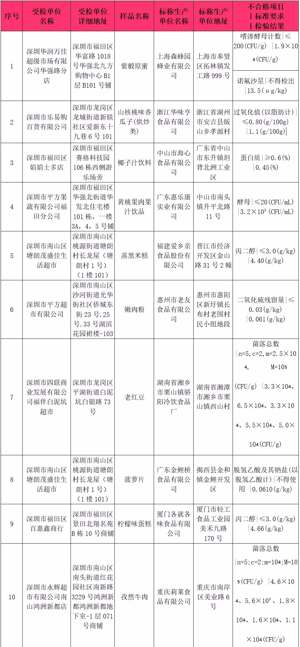 本次共抽檢流通環(huán)節(jié)食品918批次,涉及流通環(huán)節(jié)經(jīng)營主體230家次,共檢測食品指標(biāo)5434項次。其中檢出不合格樣品10批次,涉及不合格食品類別有炒貨食品及堅果制品1批次,淀粉及淀粉制品1批次,蜂產(chǎn)品1批次,糕點2批次,冷凍飲品1批次,肉制品1批次,水果制品1批次,飲料2批次;涉及不合格項目類別為獸藥殘留、品質(zhì)指標(biāo)、微生物污染、食品添加劑。