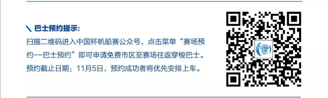 掃描二維碼進(jìn)入中國杯帆船賽公眾號,點(diǎn)擊菜單“賽場預(yù)約-巴士預(yù)約”,即可申請免費(fèi)市區(qū)至賽場往返穿梭巴士。預(yù)約截止日期:11月5日,預(yù)約成功者將優(yōu)先安排上車。