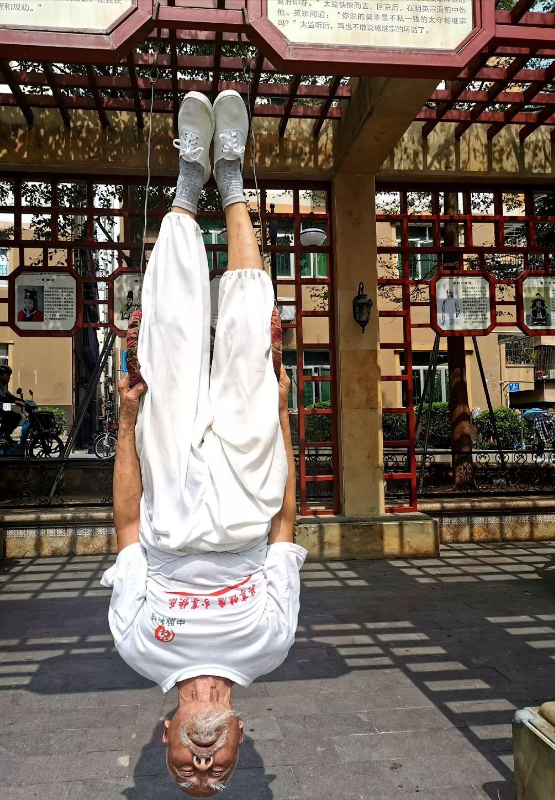 采訪當日,記者正在調試相機的時候,忽聞掌聲四起,原來魏宗信又在廣場上秀出拿手絕活“倒立”: