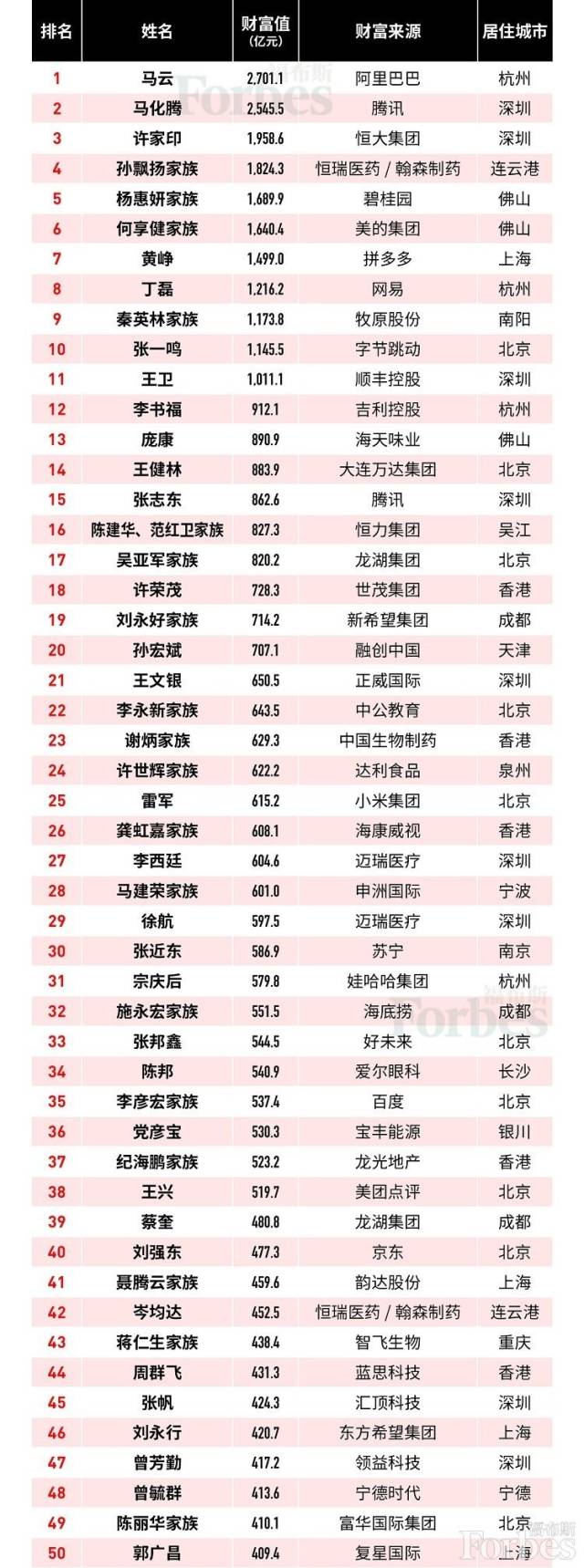 原標(biāo)題:福布斯發(fā)布2019中國富豪榜:馬云蟬聯(lián)榜首,王健林跌至第14