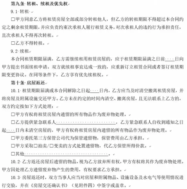 4、增設(shè)承租人下落不明時(shí),出租人對(duì)租賃房屋內(nèi)的遺留物處理?xiàng)l款。實(shí)踐中,存在很多承租人無(wú)力支付租金時(shí)斷絕與出租人聯(lián)系的情形。為解決出租人無(wú)法聯(lián)系承租人時(shí)對(duì)租賃房屋內(nèi)遺留物的處理問(wèn)題,新版合同增設(shè)承租人未按約定交還房屋且下落不明時(shí)遺留物的處理?xiàng)l款,由雙方當(dāng)事人在簽訂合同時(shí)就此問(wèn)題協(xié)商一致,避免出租人遭受無(wú)法收回房屋導(dǎo)致房屋使用價(jià)值無(wú)法實(shí)現(xiàn)的損失或者因自行處置遺留物引起糾紛、面臨侵權(quán)責(zé)任的風(fēng)險(xiǎn),有效解決承租人下落不明時(shí)租賃房屋內(nèi)遺留物的處理問(wèn)題。