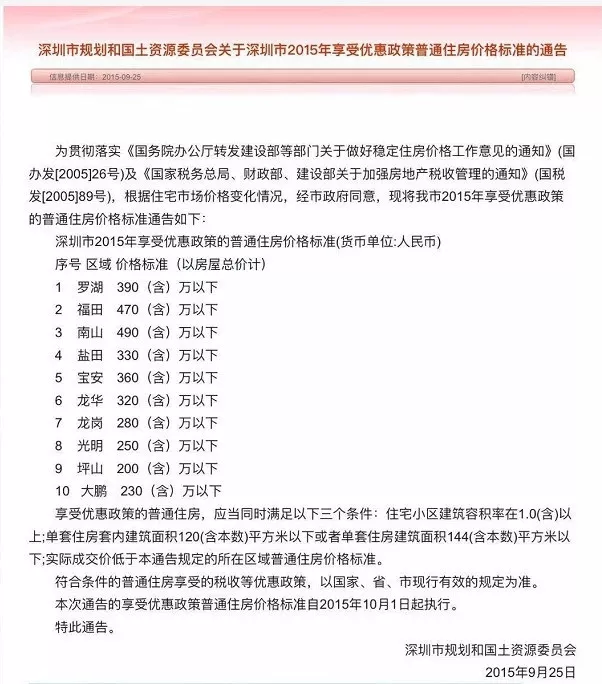 2015年,深圳普通住房標準出臺,規(guī)定南山總價在490萬以上、福田總價在470萬、羅湖總價在390萬以上的房源均屬于豪宅,需要按照豪宅的標準交稅。