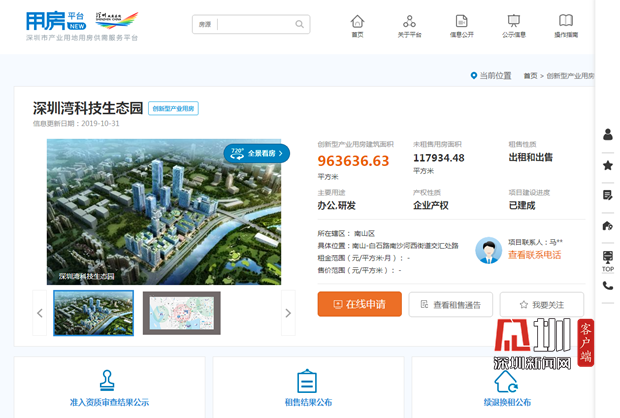記者在平臺官網(wǎng)看到,平臺不僅提供創(chuàng)新型產(chǎn)業(yè)用房申請入口、平臺專享金融服務、企業(yè)空間需求申報,還設有深圳產(chǎn)業(yè)空間地圖、720度全景看房,頁面簡潔直觀。