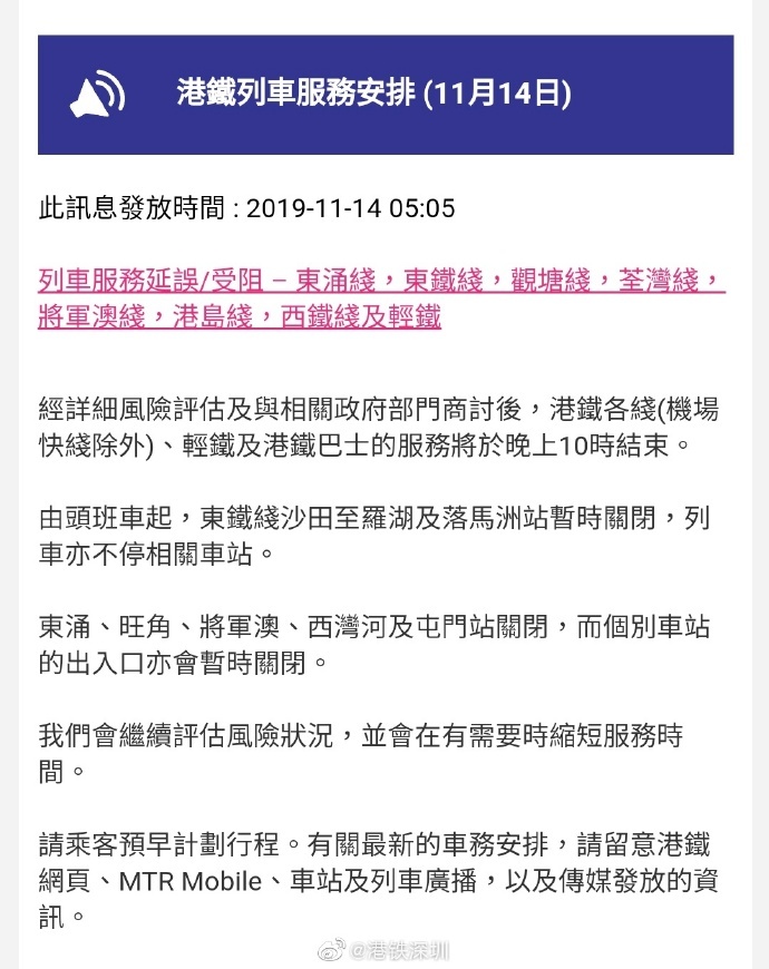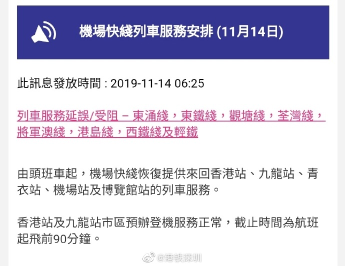 據(jù)港鐵官網(wǎng)目前最新消息,11月14日,港鐵各線(機(jī)場(chǎng)快線除外)、輕鐵及港鐵巴士的服務(wù)將于晚上10時(shí)結(jié)束,東涌線、東鐵線、觀塘線、荃灣線、將軍澳線、港島線、西鐵線及輕鐵列車服務(wù)延誤/受阻。