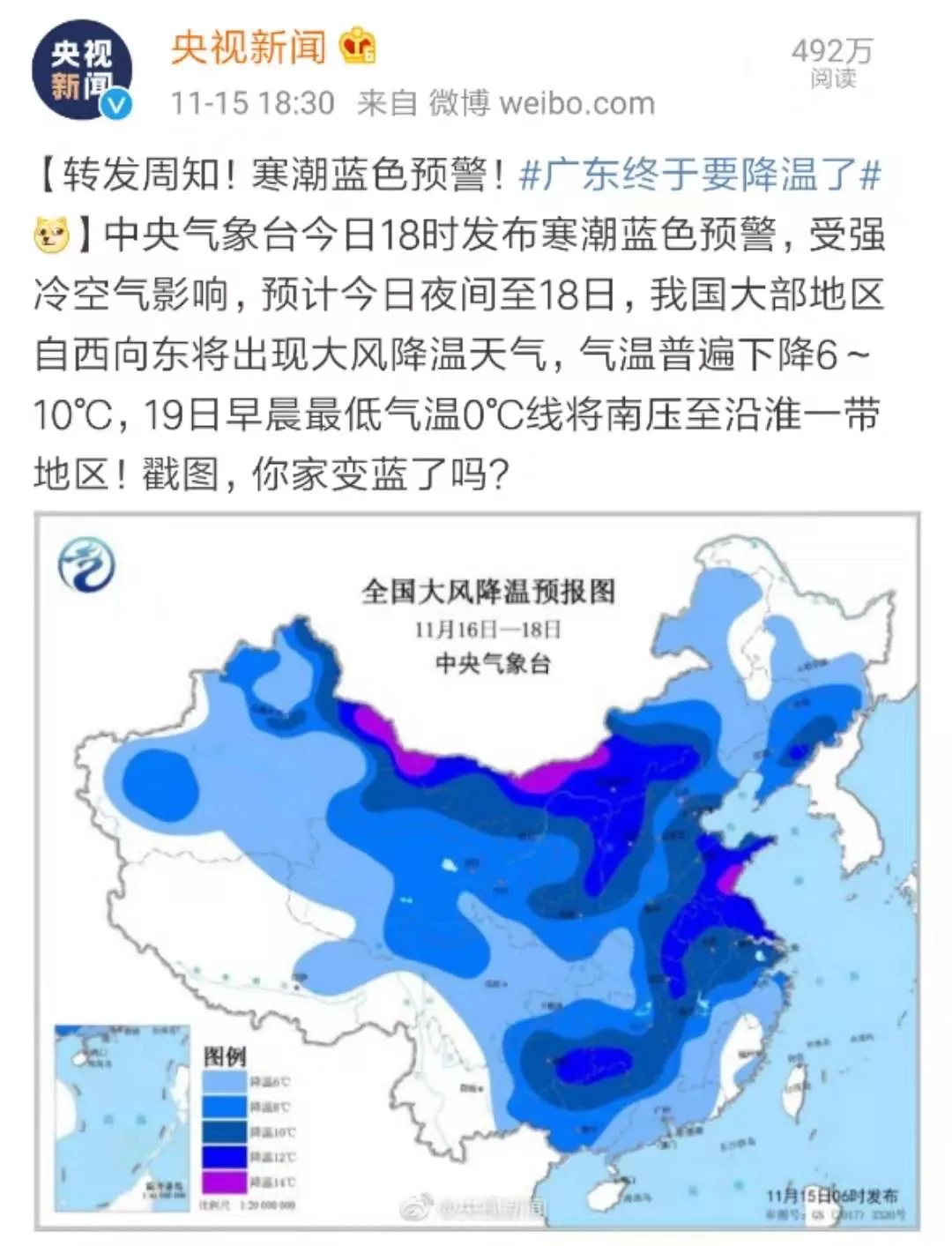 中央氣象臺于15號發(fā)布寒潮藍色預(yù)警!